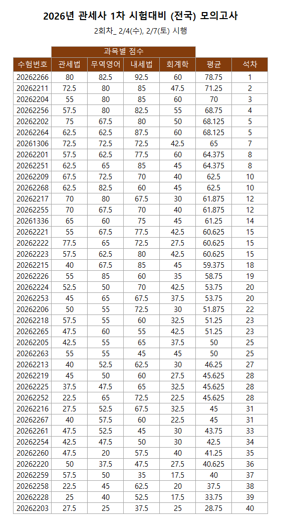 2026년 2월 4일 (수), 2월 7일 (토) 시행된 관세사 1차 시험 대비 웰페이스 (전국) 모의고사 2회차 점수 분포 안내입니다.