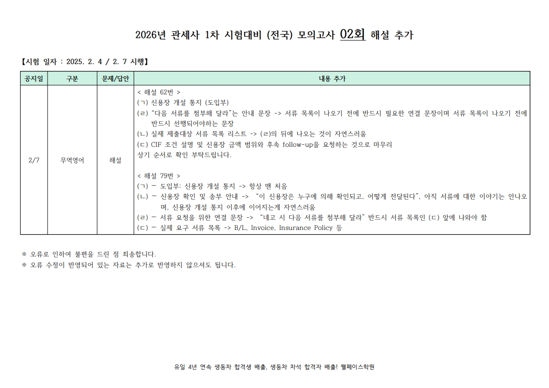 2026년 관세사 1차 시험대비 (전국) 모의고사 2회_해설 추가 내용