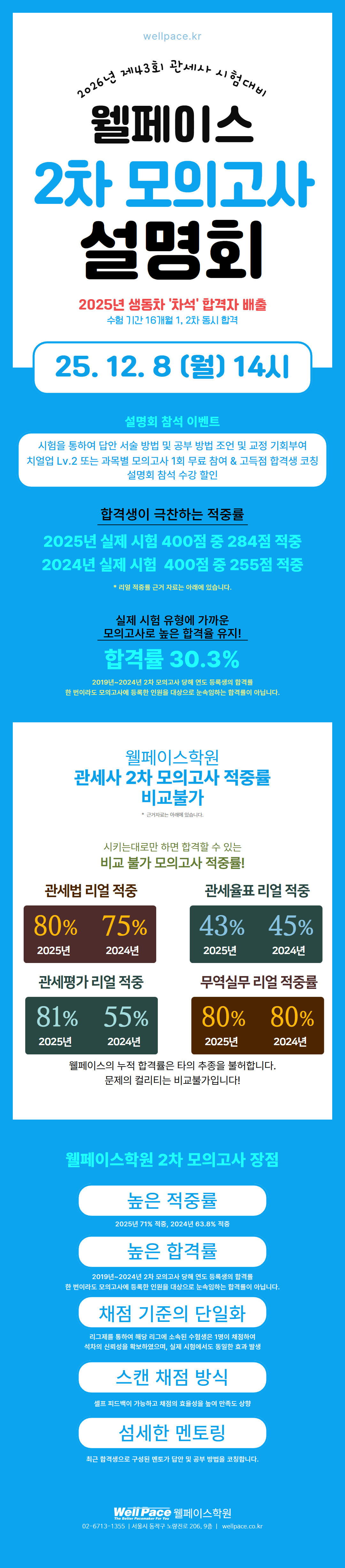 2차 모의고사 높은 적중률로 매년 가장 높은 합격률을 자랑하고 있는 웰페이스학원 2차 모의고사 합격 전략 설명회를 안내해 드립니다.
