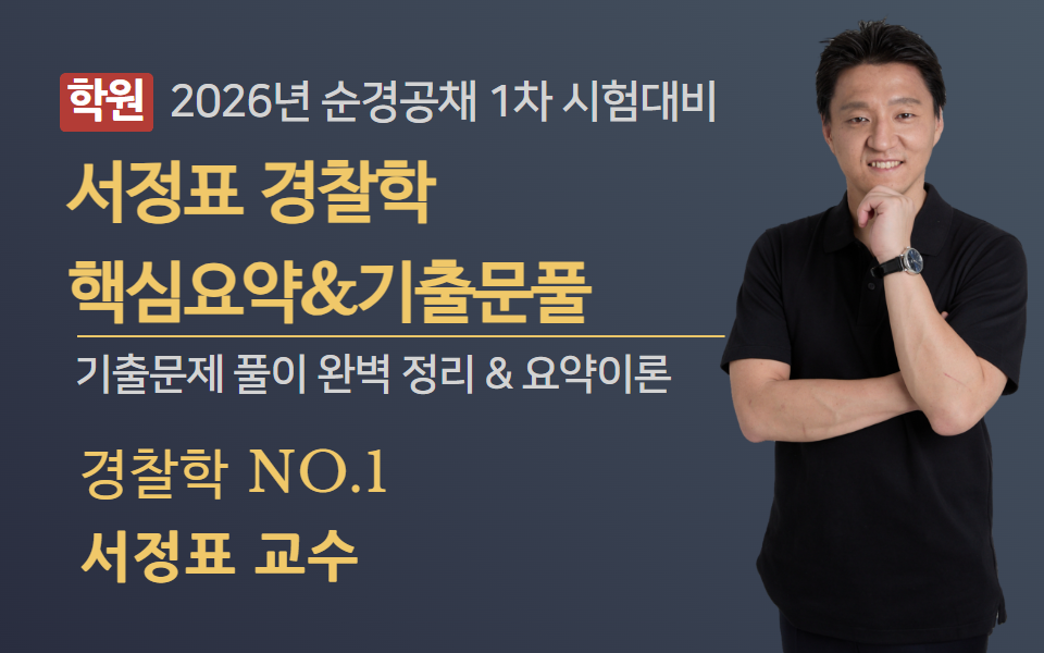 서정표 경찰학 핵심요약 정리 및 기출문제풀이 완벽 대비 학원 실강반입니다. 출제 예상 기출 집중 과정! 정상가 16만 6천원에 40%할인으로 진행 됩니다.