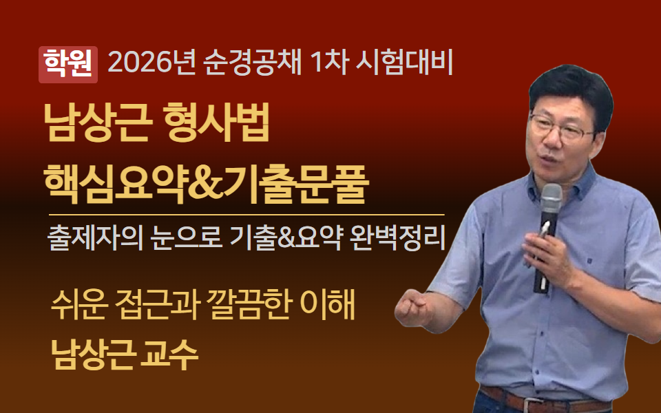 남상근 형사법 핵심요약 정리 및 기출문제풀이 완벽 대비 학원 실강반입니다. 출제 예상 기출 집중 과정! 정상가 15만 6천원에 43%할인으로 진행 됩니다.